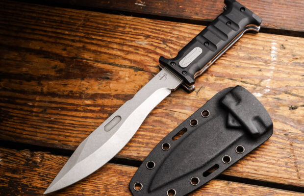Turning the handle over reveals the secondary security feature, a hand-turnable bolt that can be screwed down to keep everything double-tight. Although the symmetrical, barrel-girdle handle might evoke classic U.S. military pieces, it was evidently inspired by the baselard, a medieval short sword with a handle very much like this one. No one is expecting the Extension Knife to be light, and it weighs in at 15.6 oz. A Kydex sheath is included, to be used in conjunction with its shorter configuration.