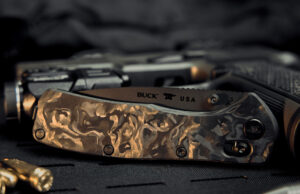 Another modern material makes an appearance for the scales, and this one is courtesy of Camo Carbon. This particular coloration of carbon fiber is called “America,” and it’s easy to see why, with streaks of red, white, and blue intermingling on the black backdrop. Polished nickel silver bolsters replace the usual brass ones, completing the modern classic vibe on this particular 110. A distressed black leather sheath is included as well.