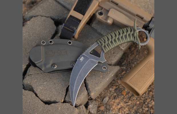 SOG has always been a company with a strong tactical background – it is, after all, embodied right there in the name (SOG stands for “Studies and Observation Group”). They’ve worked in all sorts of martially-inflected categories, both fixed and folding, so it only made sense for them to have a karambit model, a well-loved and historically-proven fighting knife format. The Gambit has been around in the SOG catalog for nearly a decade, but this is the biggest it has ever been.